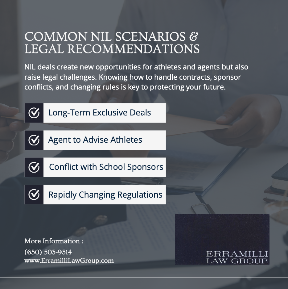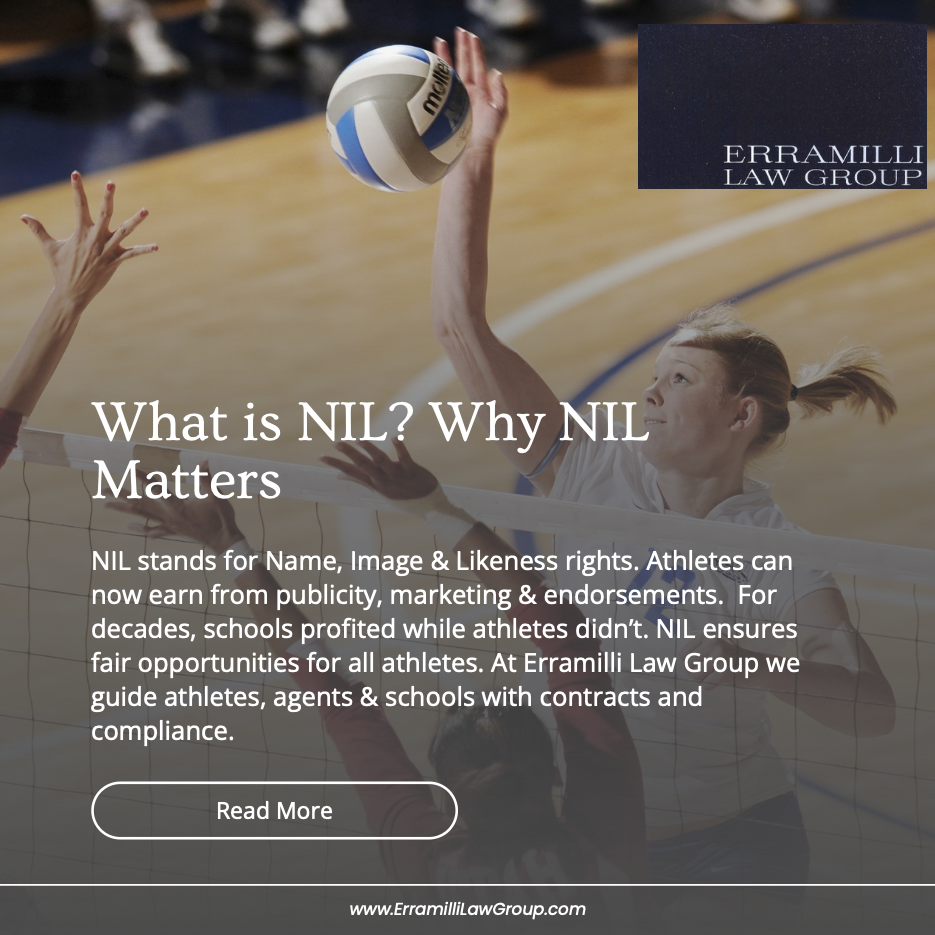 NIL agreements open the door to exciting opportunities for student athletes and agents alike but also introduce complex legal issues. Here are some common NIL situations and how to handle them wisely. At Erramilli Law Group, we help athletes protect their rights, maximize opportunities, and navigate his fast-changing field.